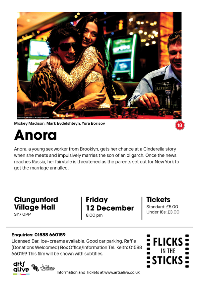 Flicks in the Sticks is held monthly at Clungunford Village Hall for 10 months of the year (we have a break during July and August).